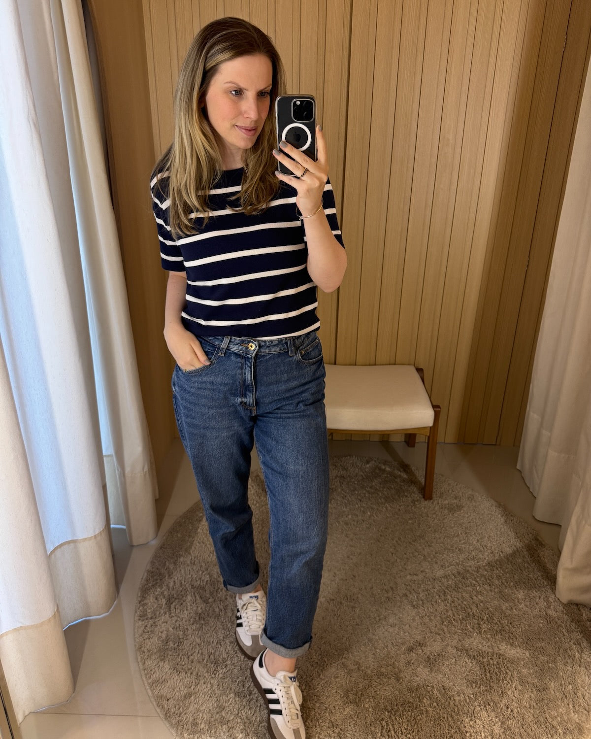 Blusa t-shirt listrada confeccionada em tricot, manga posta e decote redondo. Um tricot clássico e atemporal, facilmente usável com saias, calças e bermudas.
