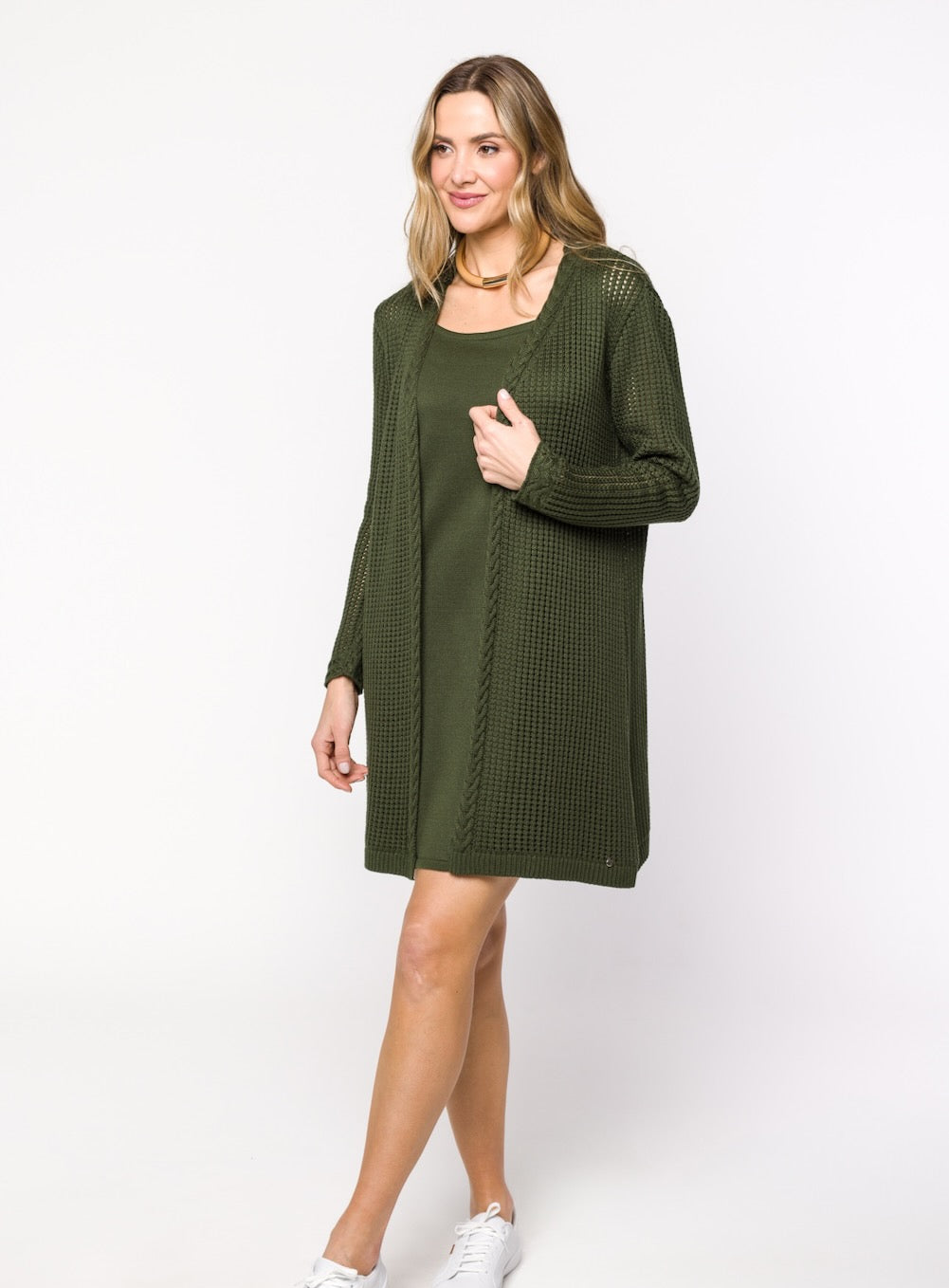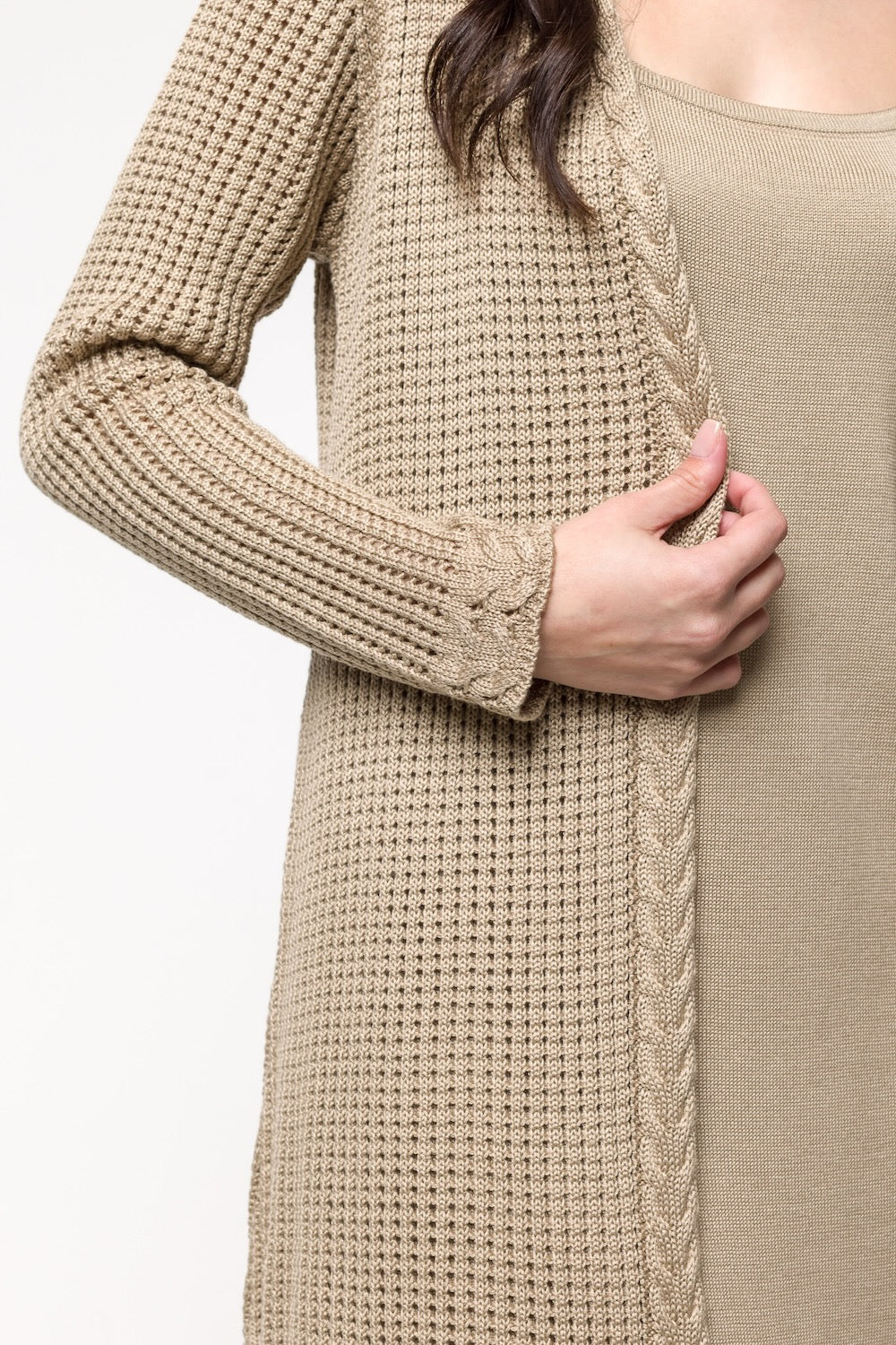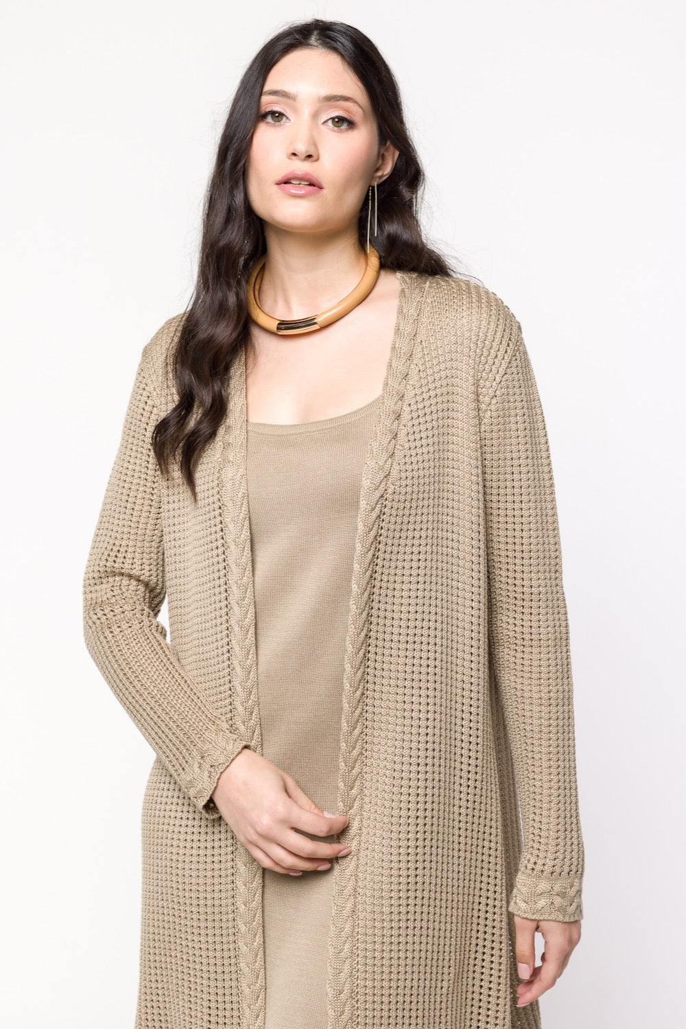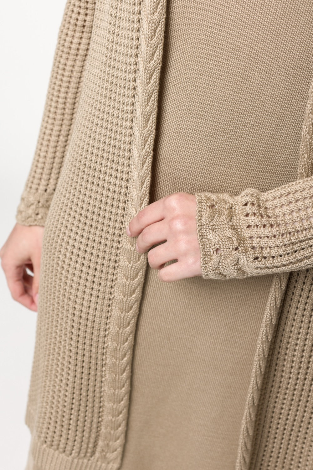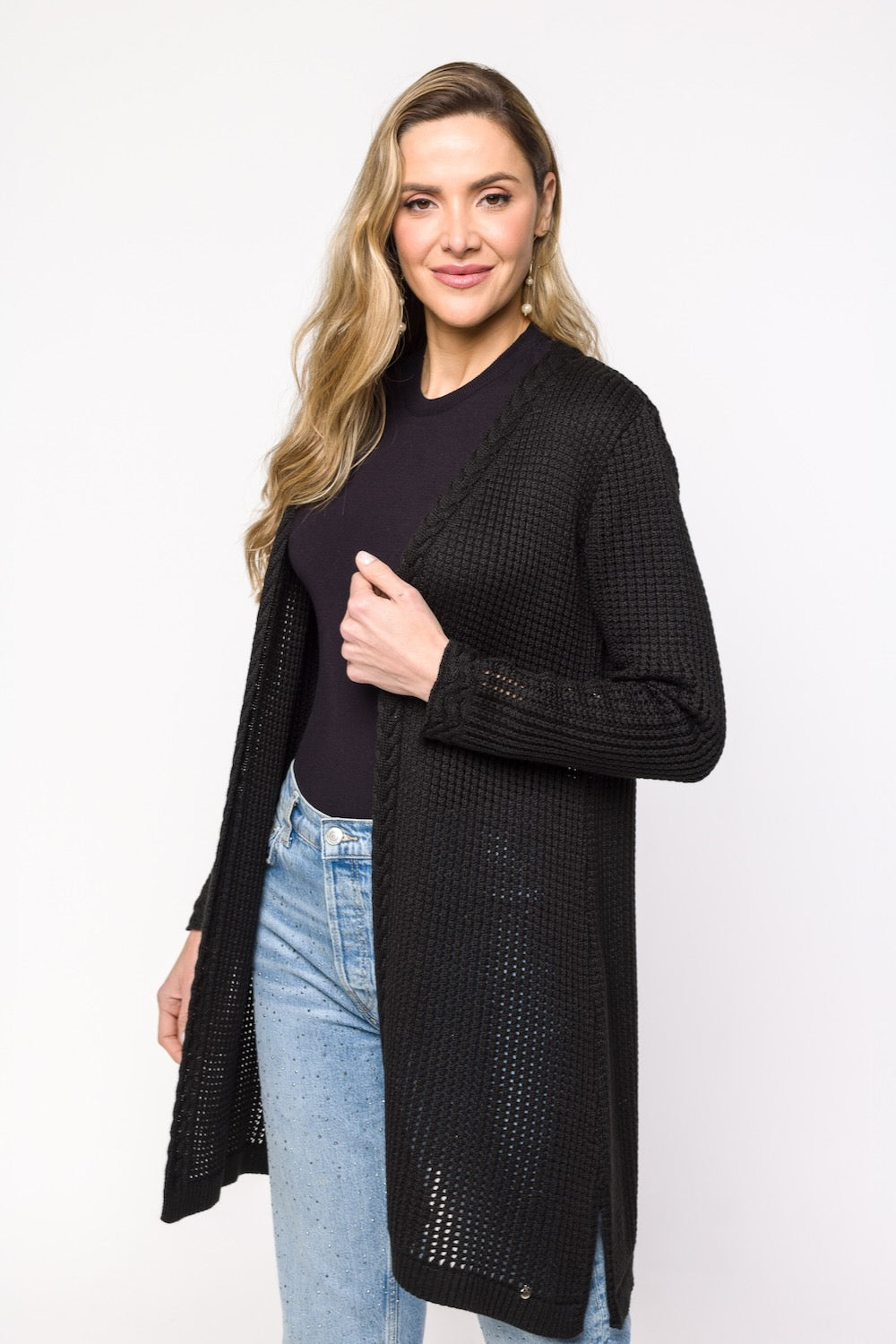 Casaco tricot alongado, manga posta e trabalho perfurado em toda peça com uma trança que segue o seu acabamento.