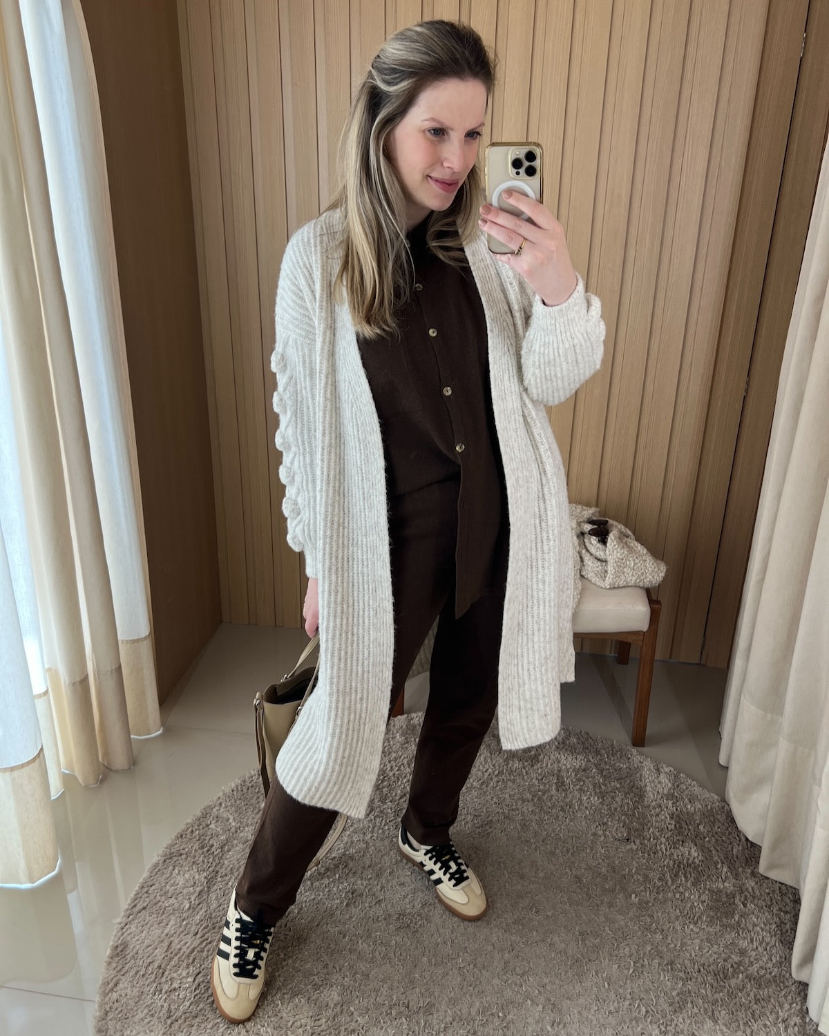 Este conjunto em tricot é perfeito para quem busca elegância e conforto. Feito com materiais de alta qualidade, a camisa possui botões naturais e a calça reta proporciona um caimento impecável.