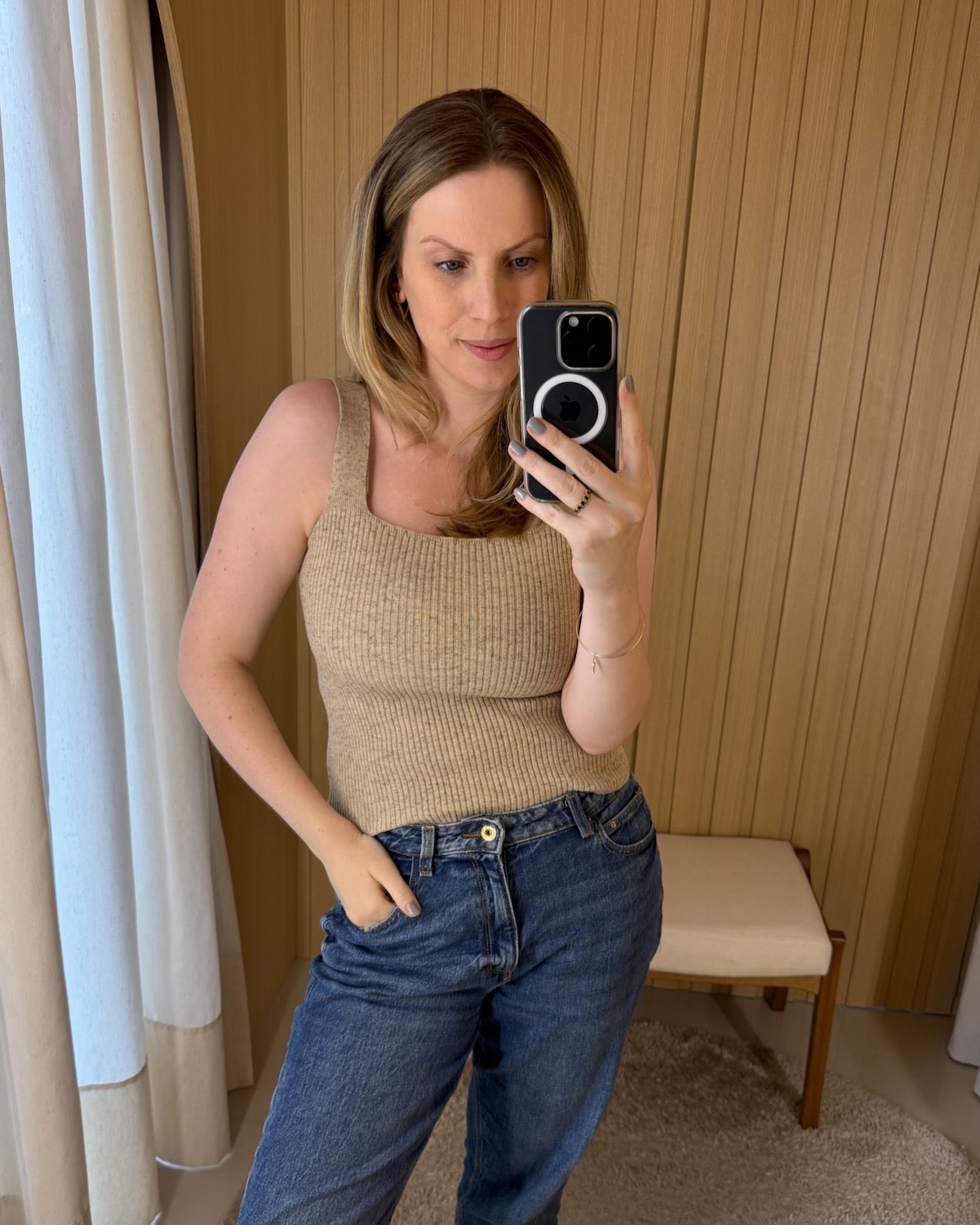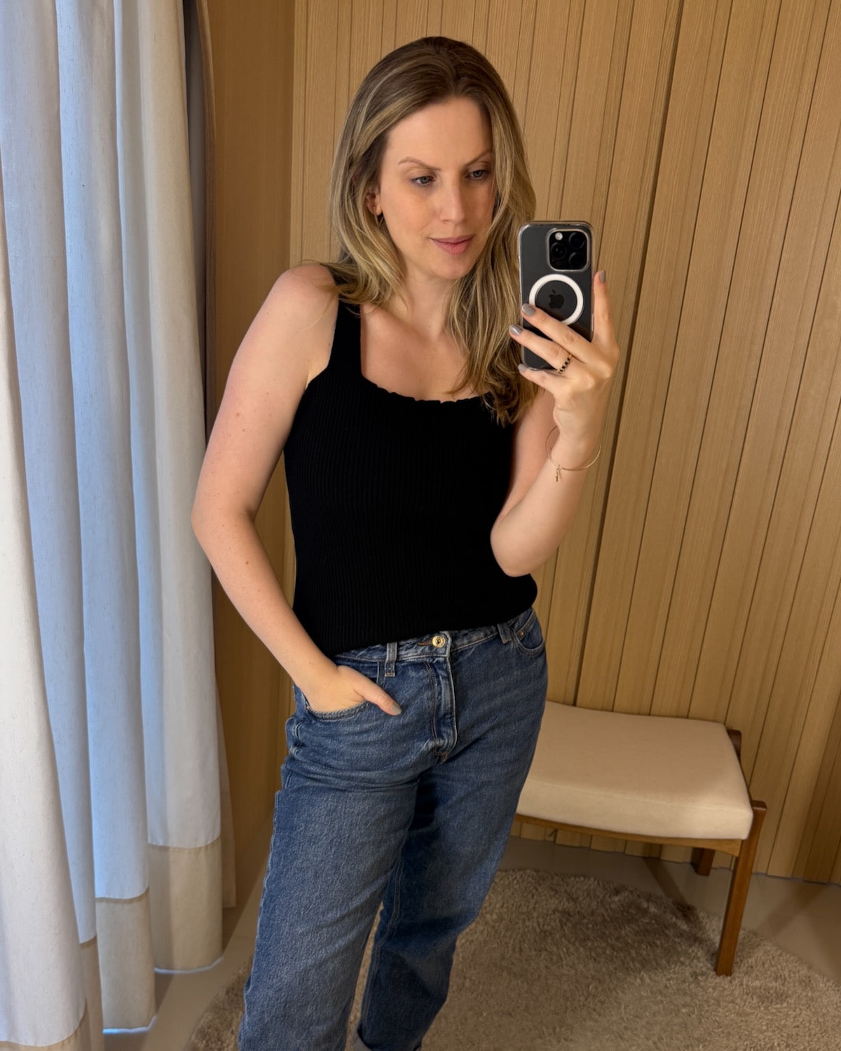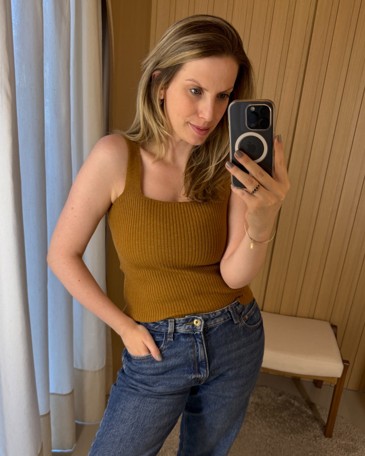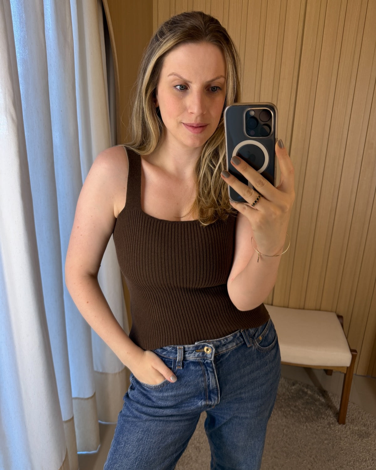 Regata em tricot com estrutura canelada e decote quadrado que valoriza o colo e o busto. Peça versátil que se adapta a diferentes ocasiões, desde looks despojados até composições mais elaboradas.