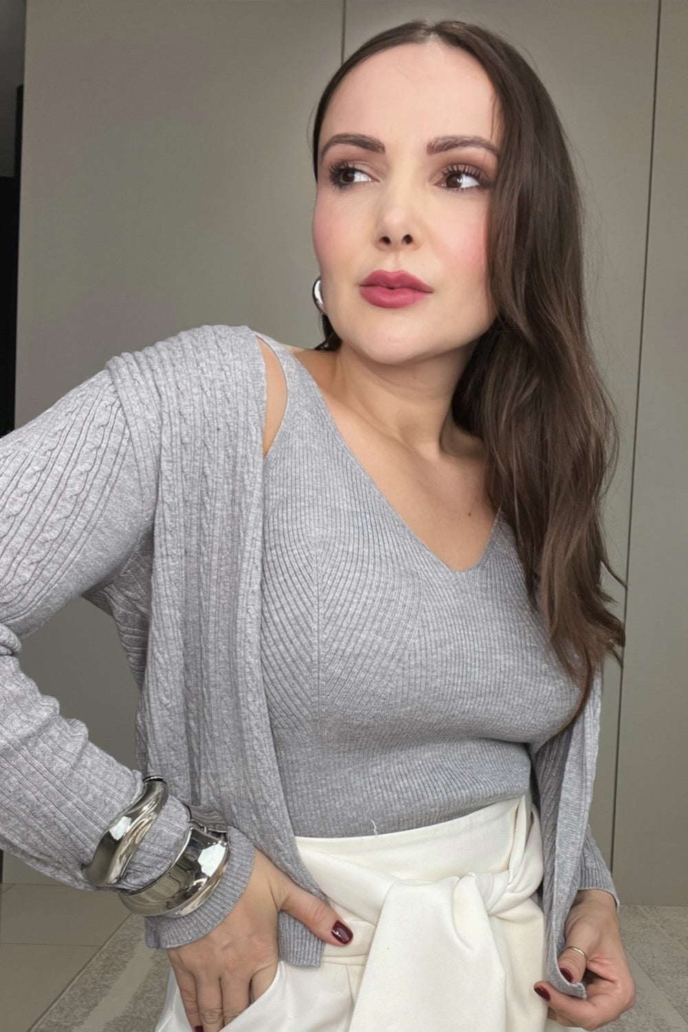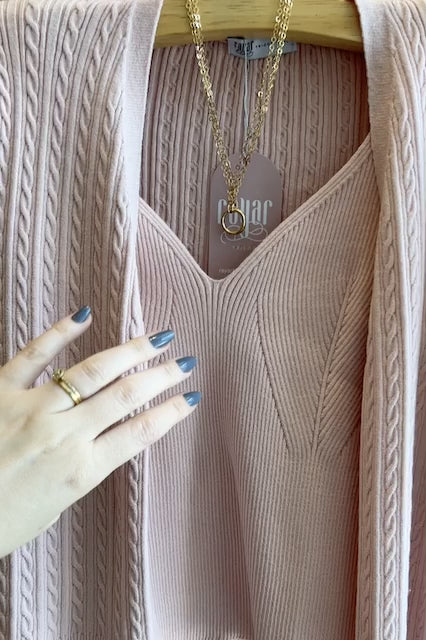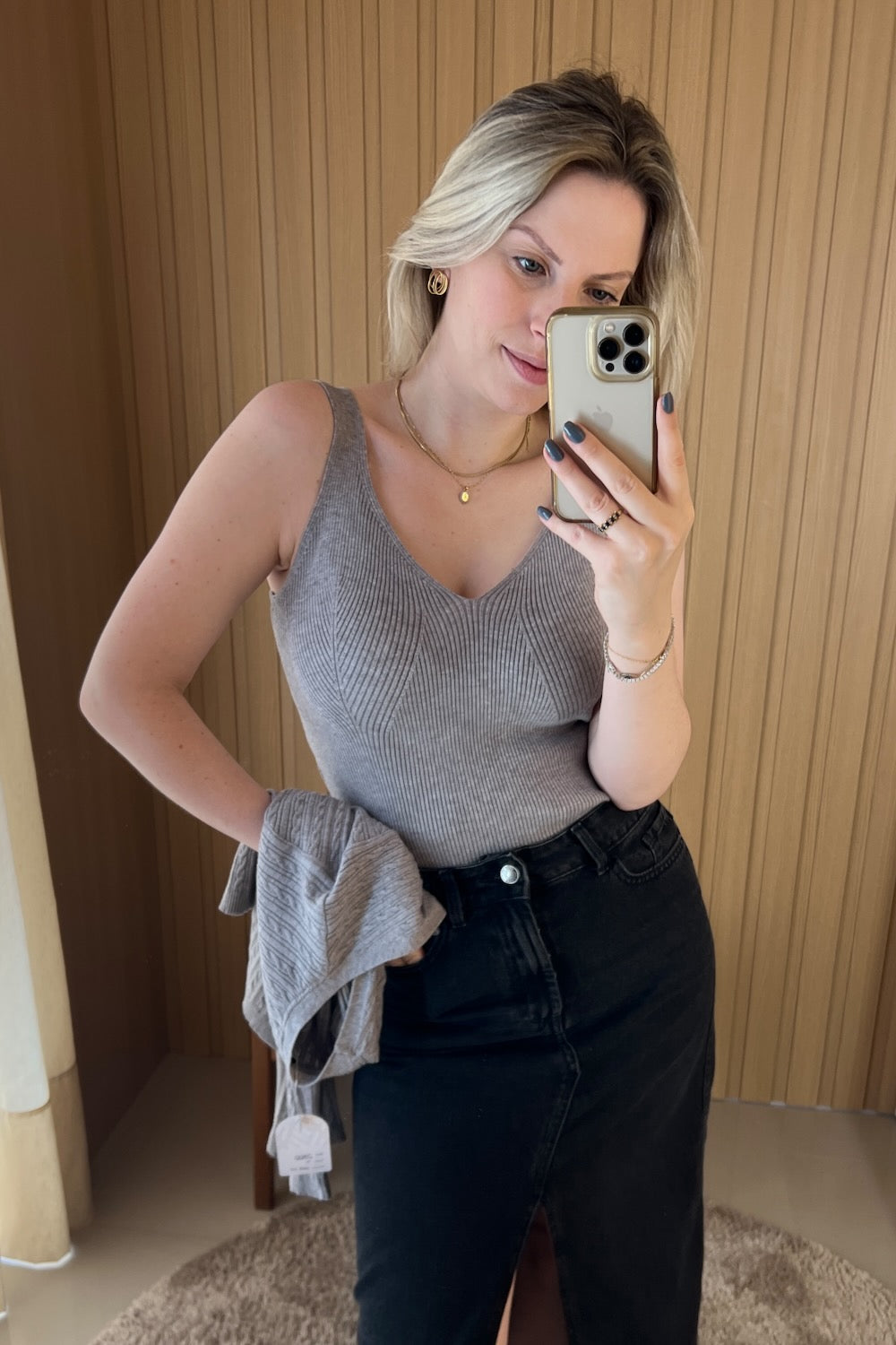 Regata em tricot canelada, possui alças largas e decote V, onde é possível usar sutiã que não ficará aparente.